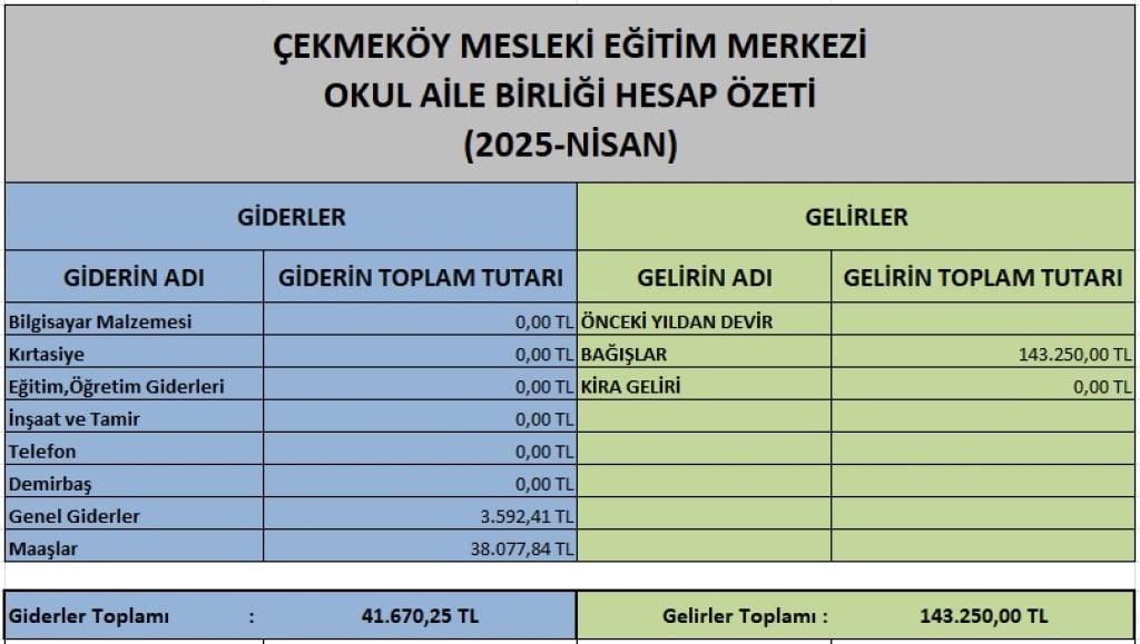 2025 Nisan Ayı Okul Aile Birliği Gelir-Gider Tablosu