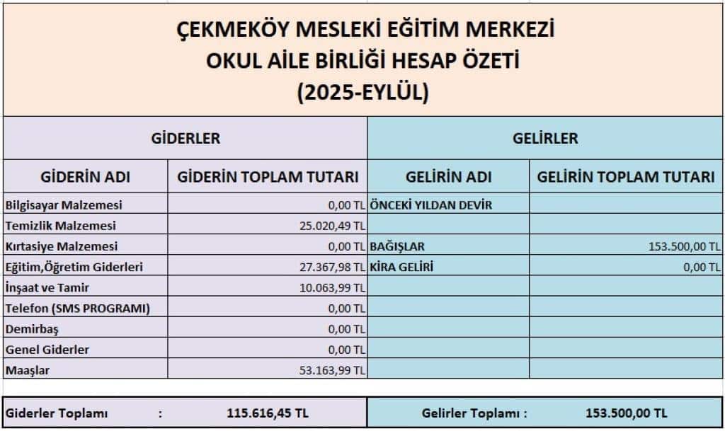 2025 Temmuz-Ağustos-Eylül Ayı Okul Aile Birliği Gelir-Gider Tablosu
